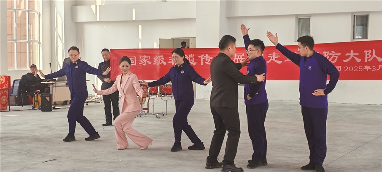 昌吉市“‘追锋新时代 弘扬新风尚’学雷锋·文明实践我行动”文明实践活动在昌吉市消防救援大队开展,兵团豫剧团的老师为消防员教授豫剧表演动作。□左琼鸽摄