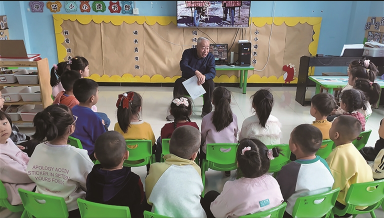 吉木萨尔县第三幼儿园邀请县关工委“五老”成员高明潜老师给小朋友们讲述雷锋的故事。□艾孜买提摄