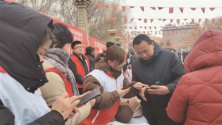 奇台县“学雷锋·文明实践我行动”主题活动暨新时代文明实践集市活动启动,志愿者在文明实践集市上宣传社保、就业创业等方面政策。□孙 丽摄