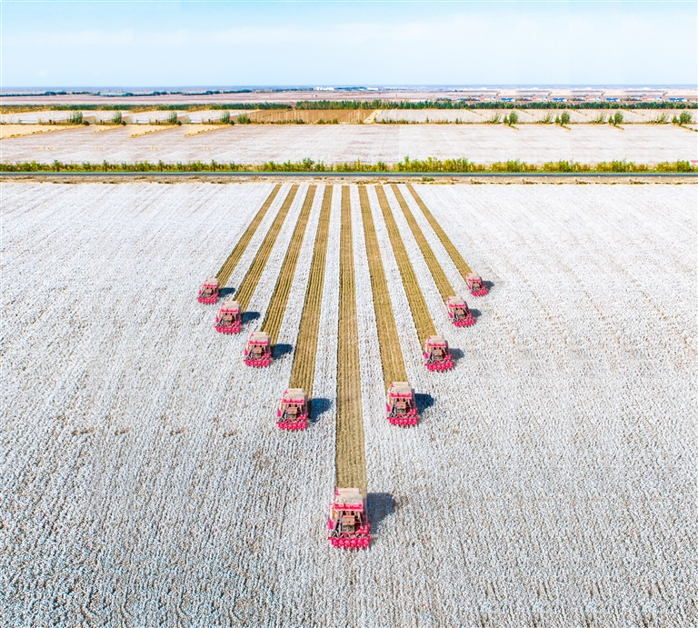 在昌吉国家农高区棉田里,大型采棉机穿梭其中,有序采收棉花。资料图片