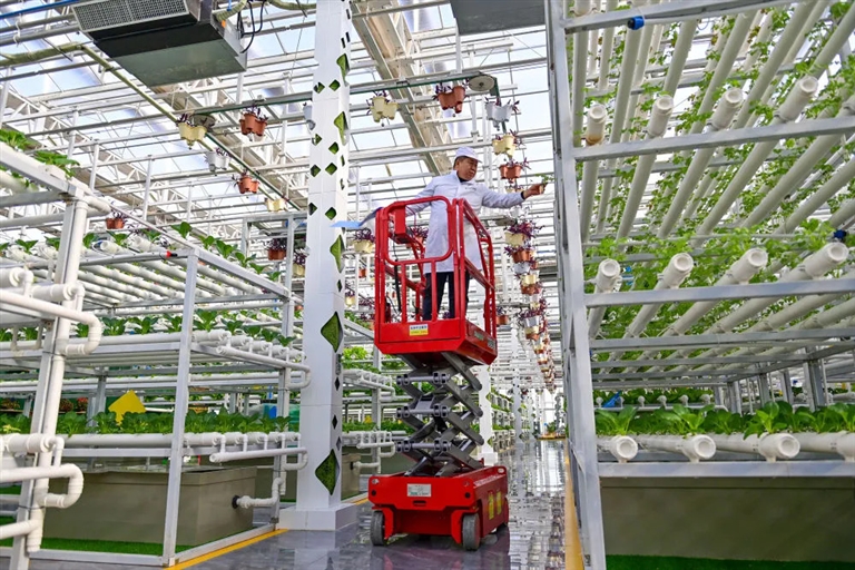 在昌吉国家农高区智慧农业科技馆,负责人闫冀在查看蔬菜的长势。□新华社记者 丁 磊摄