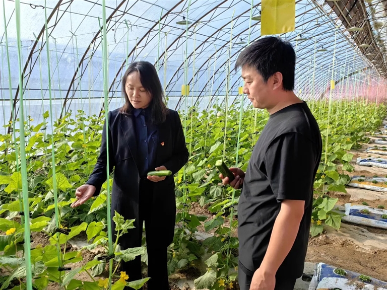在中国农科院西部农业研究中心温室基地,中国农科院西部农业研究中心绿洲节水与戈壁生态农业创新团队执行首席、研究员马月虹(左)和甘肃瑞盈热力有限公司市场经理夏亮探讨黄瓜种植技术。记者 王 薇摄