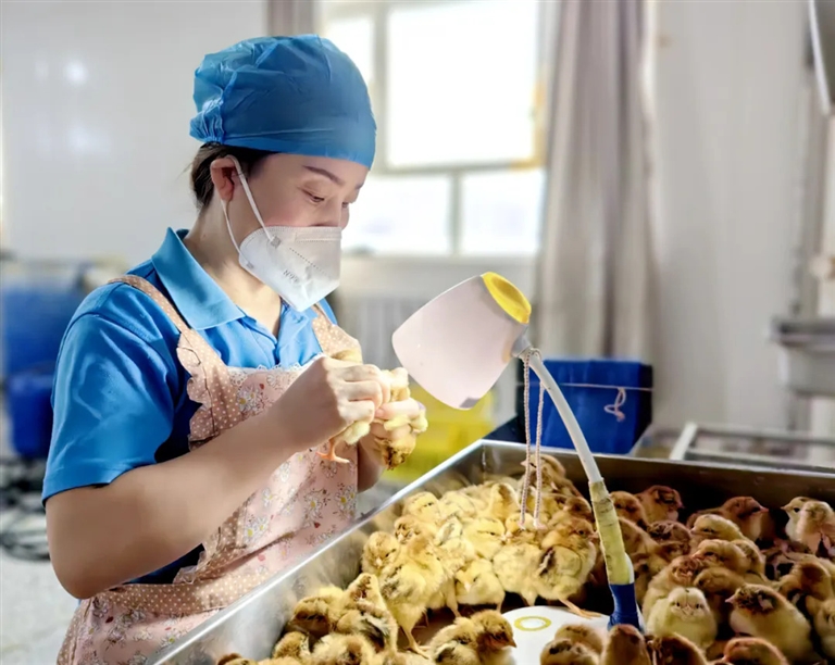 2月11日,在鸡苗雌雄弱残鉴别车间,新疆泰昆集团食品事业部孵化中心工作人员正在分批对鸡苗进行性别、弱残检查。记者 王 薇摄
