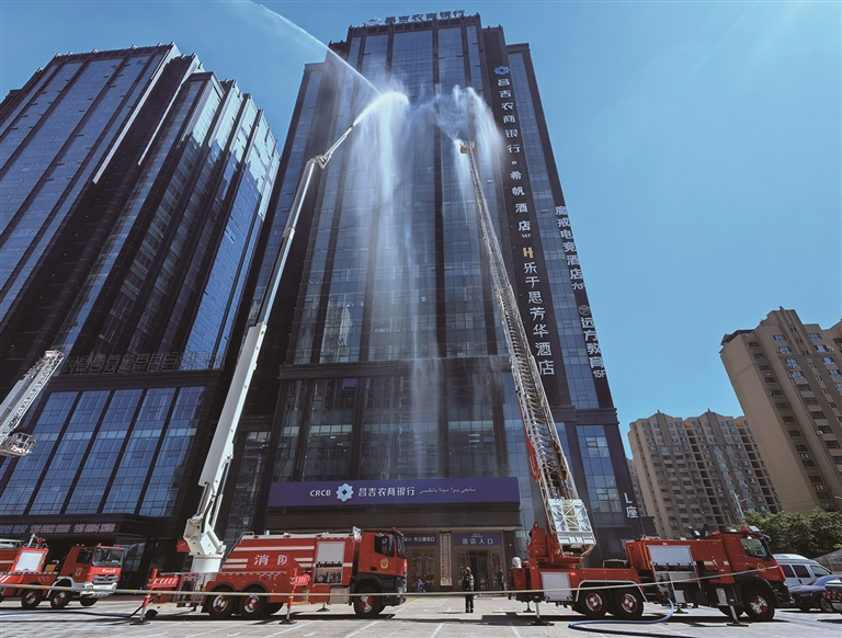 近日,昌吉州消防救援支队开展高层建筑灭火救援综合实战演练。图为演练现场。记者 付小芳摄
