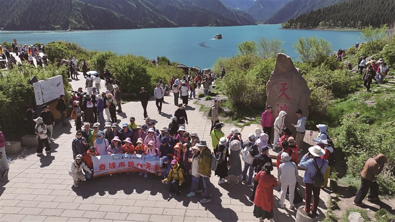 端午假期,天山天池景区游客多以团队游、自驾游为主。图为游客在天山天池打卡拍照。 □张 鹏摄