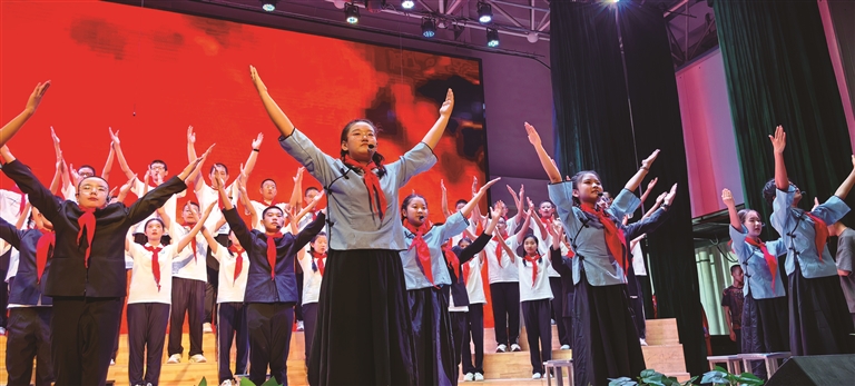 《将进酒》《岳阳楼记》《木兰辞》这些耳熟能详的经典篇目,在学生们抑扬顿挫的朗诵和惟妙惟肖的演绎下,将诗歌中的风骨和诗人的情怀展现得淋漓尽致。《仰望星空》则将诗词与航天元素巧妙融合,在诵读中描绘出中国航天人追寻飞天梦想的不懈努力和感人场景。学生们还将书法、古筝、茶艺、武术、水袖舞等表演融入其中。