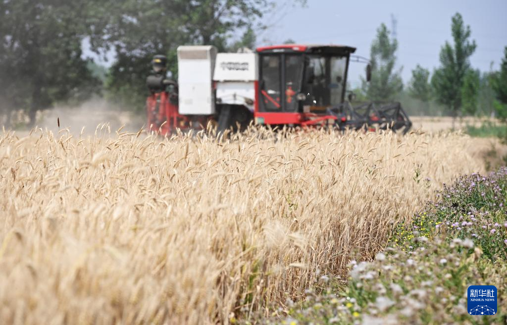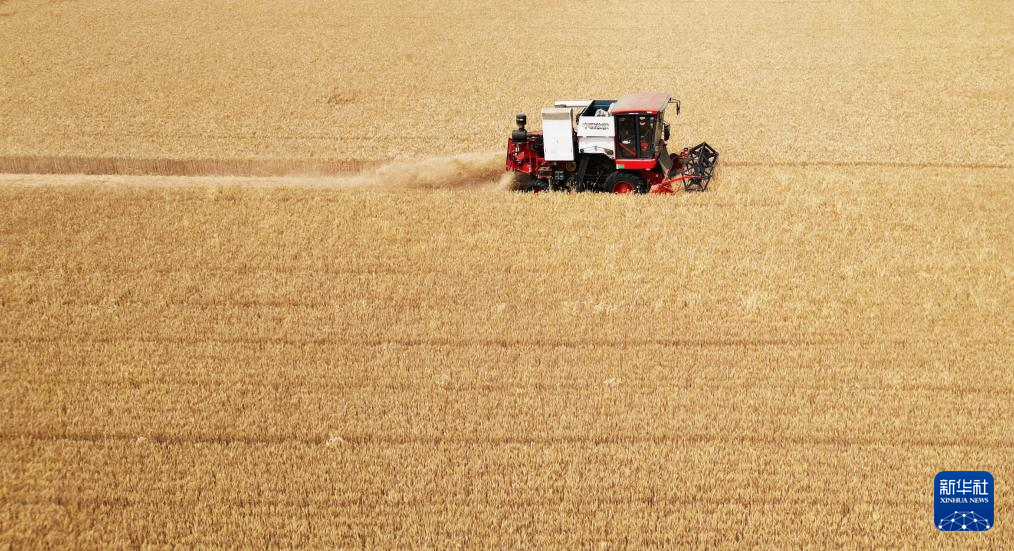 6月2日,农机手驾驶联合收割机在山东省滕州市南沙河镇河汇村麦田里收割小麦。新华社发(李志军摄)