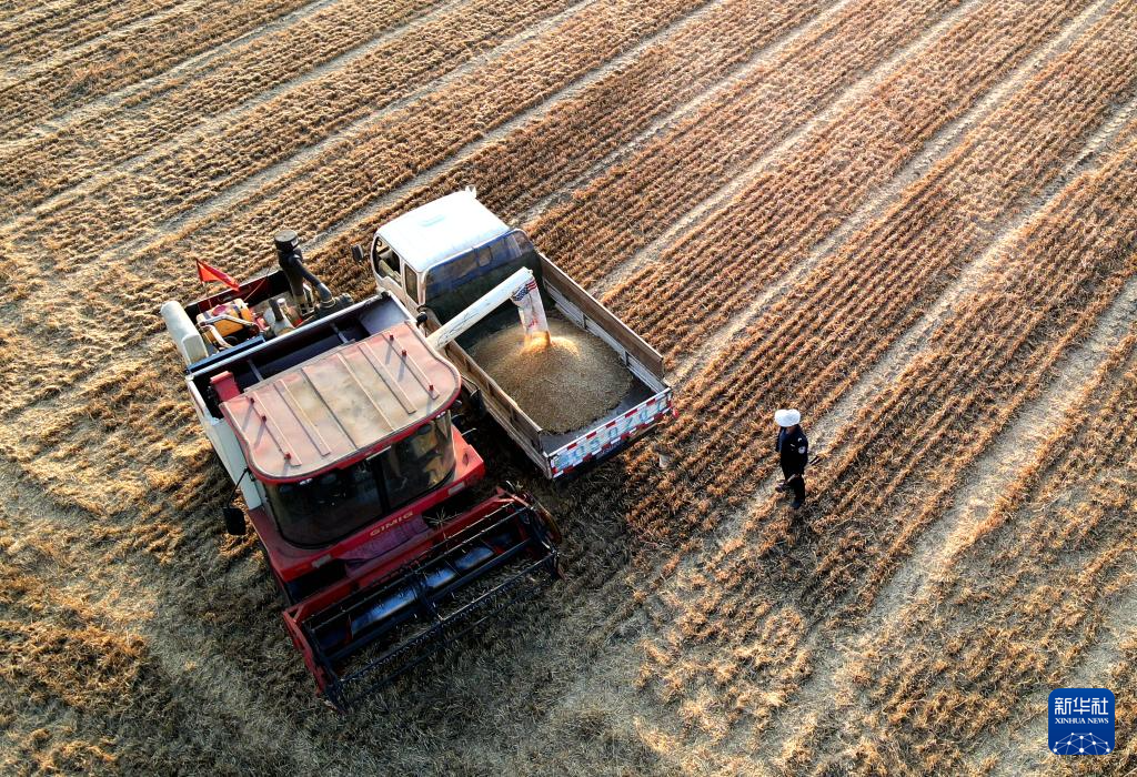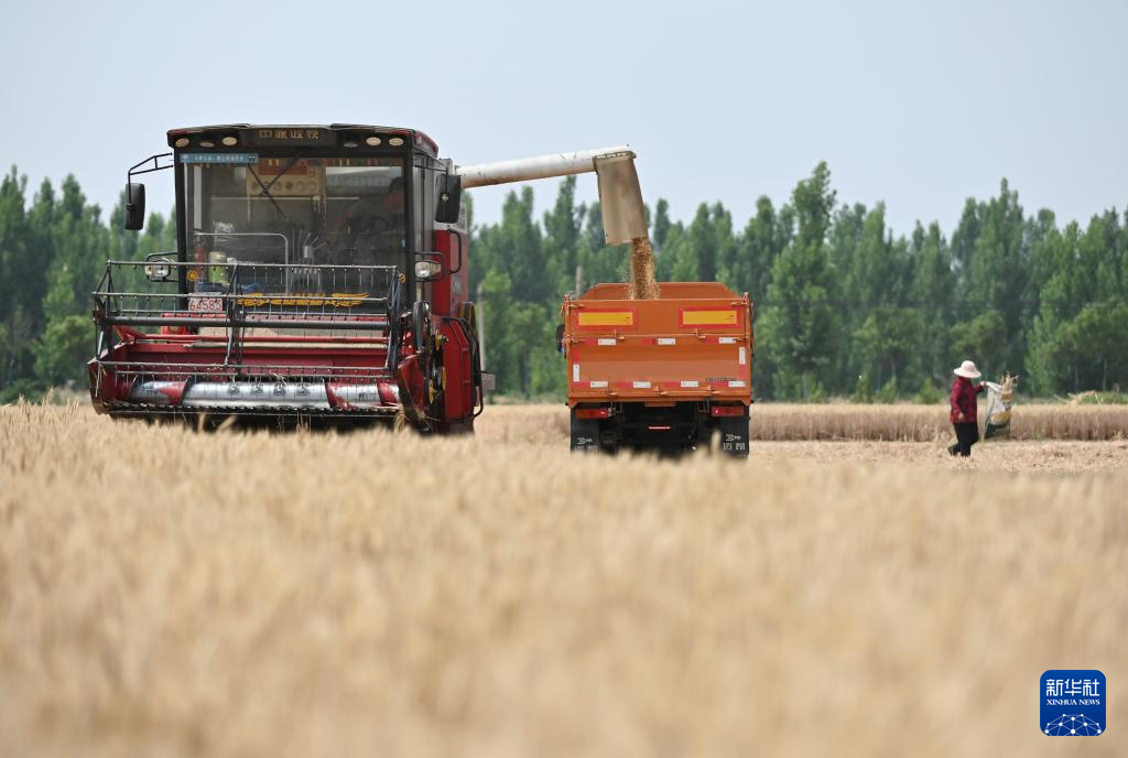 6月2日,农机手在山东省滕州市南沙河镇河汇村麦田里将小麦装车。新华社发(李志军摄)