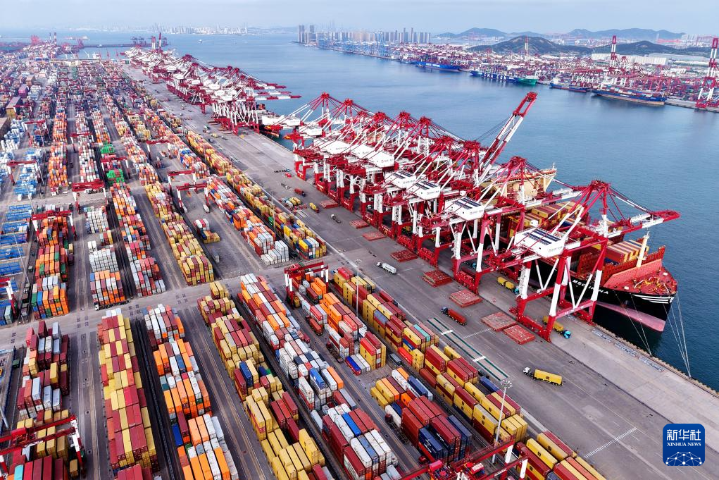 5月5日,在山东港口青岛港,货轮在装卸外贸集装箱(无人机照片)。新华社发(俞方平 摄)