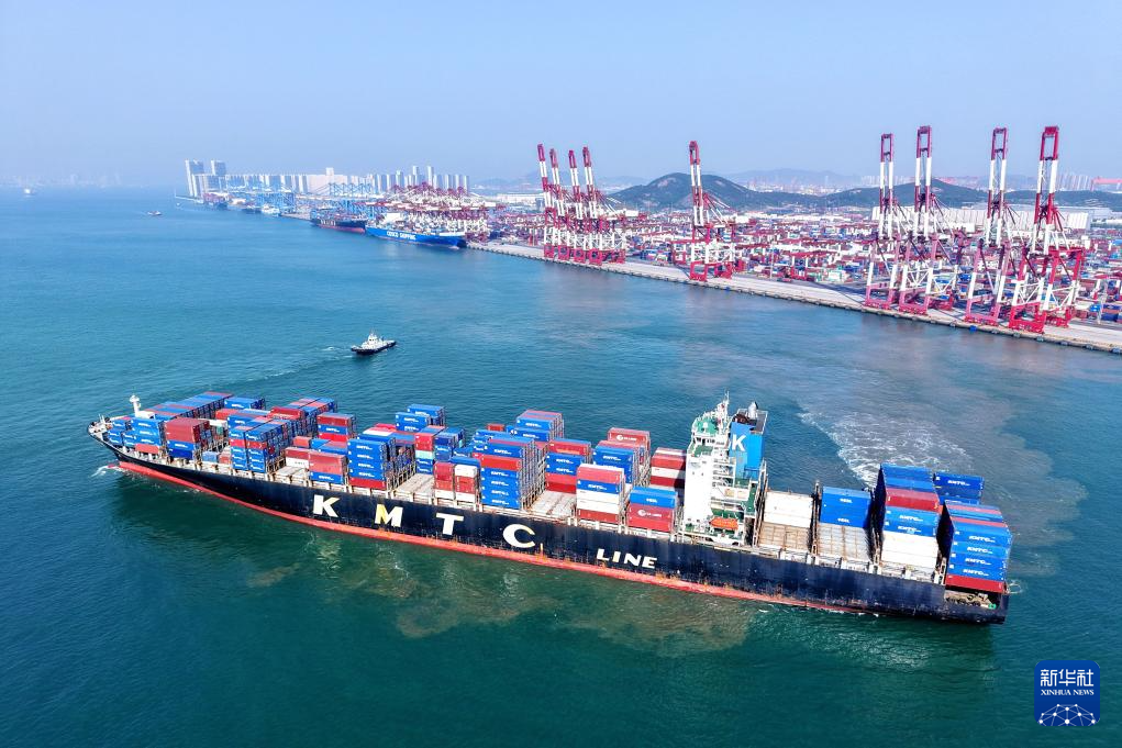 5月19日,山东港口青岛港,装载外贸集装箱的货轮驶出港口(无人机照片)。新华社发(俞方平 摄)