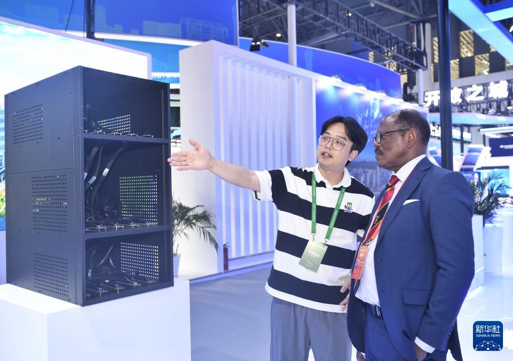 6月11日,参展商在向外宾介绍展出的高性能gpu服务器。新华社记者 刘坤 摄