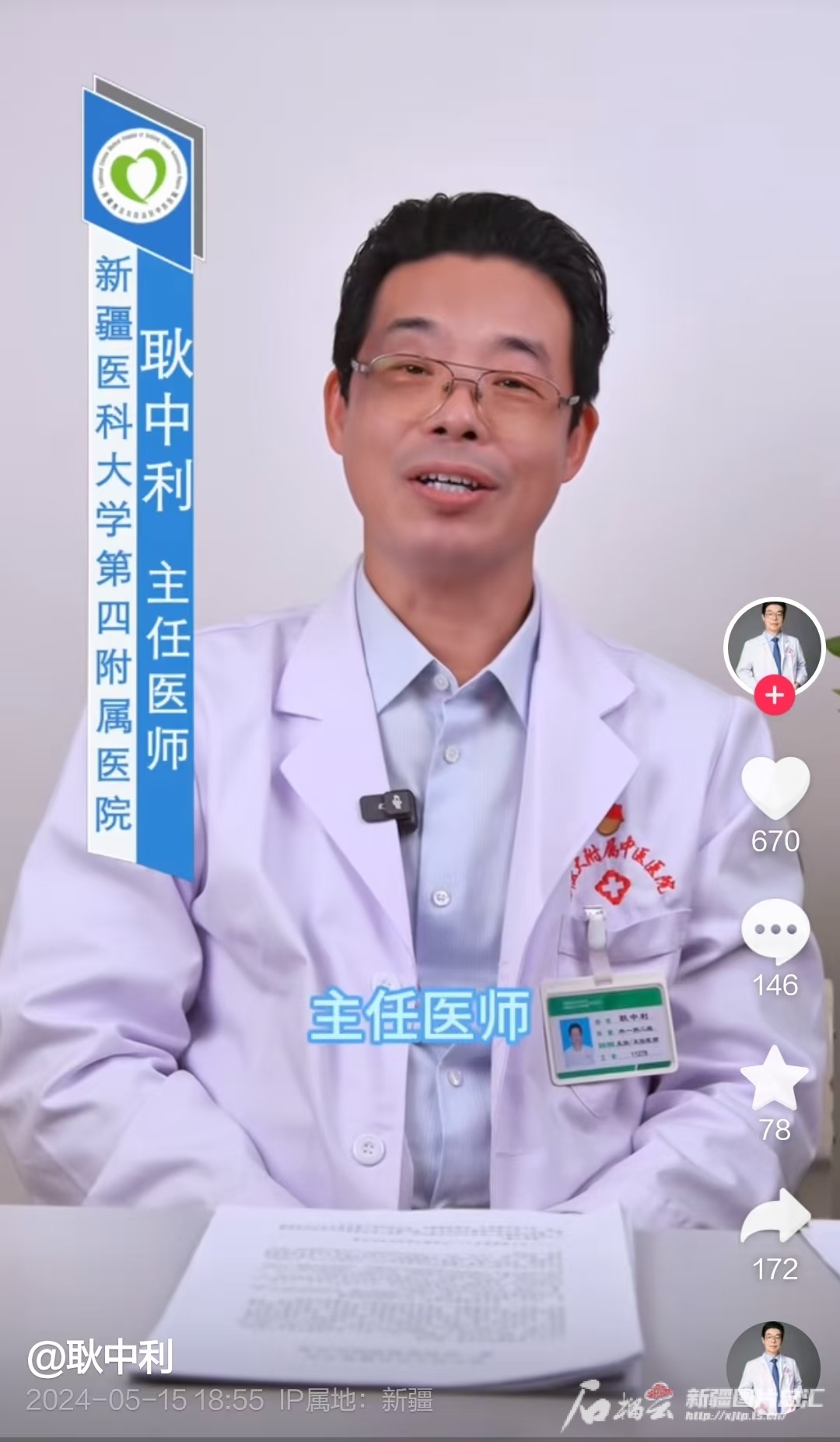 2024年5月15日,新疆医科大学第四附属医院(自治区中医医院)普外二科主任耿中利在抖音平台首次“触电”。视频截图