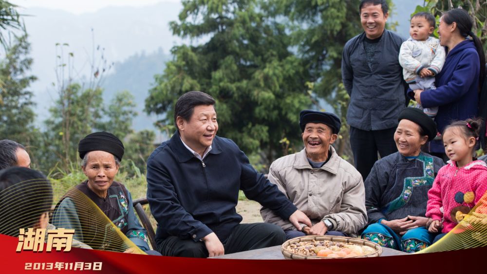 2013年11月3日,习近平来到湖南省湘西土家族苗族自治州花垣县十八洞村。在苗族贫困村民施齐文家中看望时,习近平坐下来同一家人算收支账,询问有什么困难、有什么打算,勉励一家人用勤劳和智慧创造美好生活。随后,习近平同村干部和村民代表围坐在一起,亲切地拉家常、话发展,听村民们谈变化、讲困难、道实情。