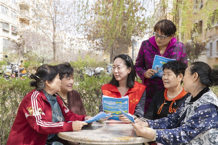 4月14日,昌吉市宁边路街道净化社区,社区干部向居民讲解国家安全知识。在第十个全民国家安全教育日来临之际,昌吉市宁边路街道净化社区开展主题宣讲活动,社区干部和辖区辅警通过展板、海报、讲解等形式,向居民讲解国家安全等法律法规,增强居民对总体国家安全观的认识,共筑国家安全防线。记者 巨海成摄