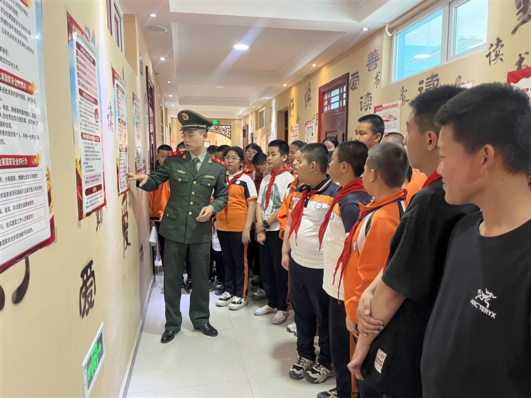 图为驻地部队官兵向昌吉市第一小学学生宣传讲解国家安全知识。 □杨雯雯摄