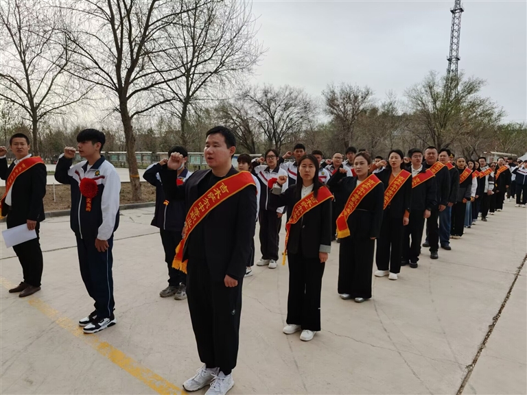 图为吉木萨尔中等职业技术学校(技工学校)师生举起右拳,庄严宣誓,当好国家安全的“守护者“。□刘艳红摄