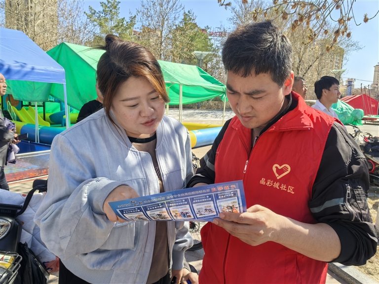 4月14日,昌吉市建国路街道晶彩城社区联合昌吉州文旅局、昌吉州广场舞运动协会共同在昌吉市塔城路带状公园举办国家安全教育日活动。通过“宣讲 文艺”的形式,推动全民国家安全教育深入人心。图为普法志愿者向居民宣传反诈知识。记者 米桃乐摄