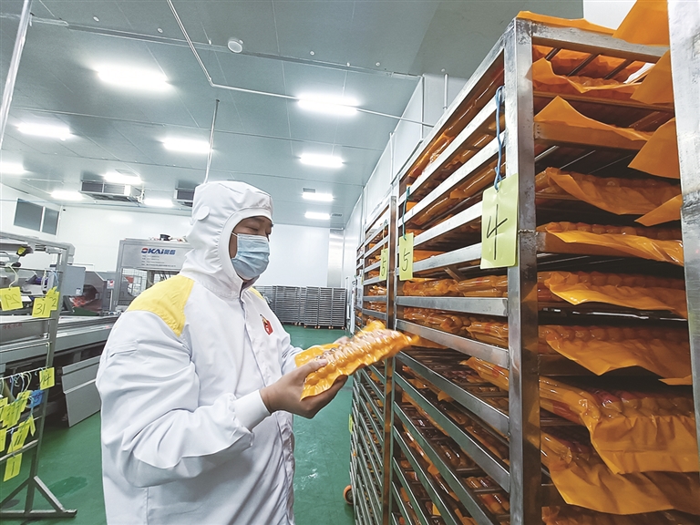 5月8日,位于昌吉国家高新技术产业开发区(以下简称昌吉国家高新区)的新疆亚盛格食品有限公司(以下简称亚盛格食品)生产车间里,鲜肉等食材经过筛选、拌馅、灌装、蒸煮、冷却等21道生产工序,被加工成一根根圆鼓鼓的小烤肠。完成真空包装后,这些2公斤重的袋装烤肠被推入速冻室,通过冷链车即将发往西北地区。“目前,企业每天可生产35万根烤肠,通过持续的技术革新与品质管控,今年预计实现产值6000万元。”亚盛格食品董事长彭建军的话语中透着自信。