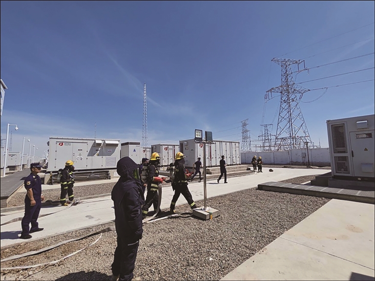 在电池舱突发热失控火情模拟演练中,变电站值班人员30秒内完成初期火情研判与应急广播预警,3分钟内联系阜康市消防大队,现场运维人员同步对起火设施进行隔离断电;阜康市消防大队接警后迅速出警,及时抵达现场,采用水喷雾隔离降温战术成功扑灭火情。