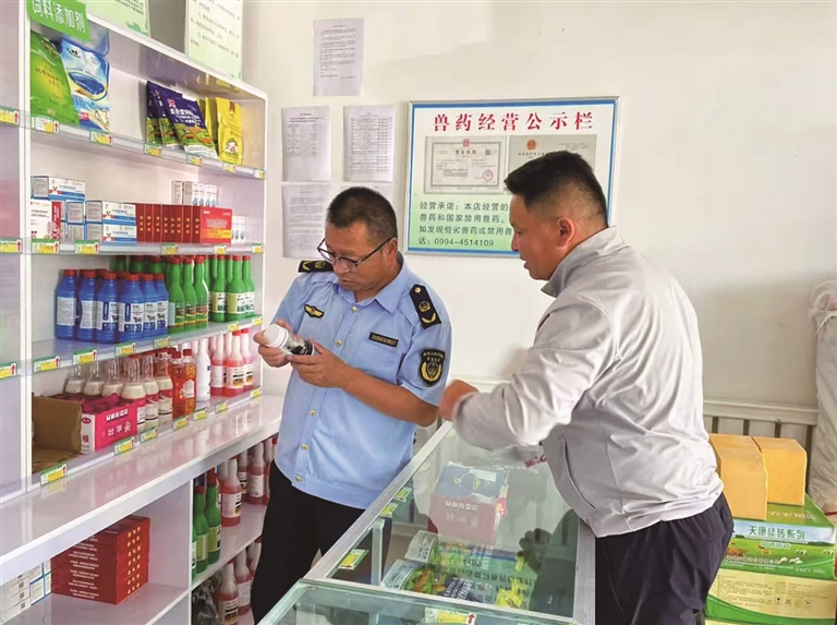 图为呼图壁县农业农村局执法人员走进商铺开展兽药专项执法检查。徐承秀摄